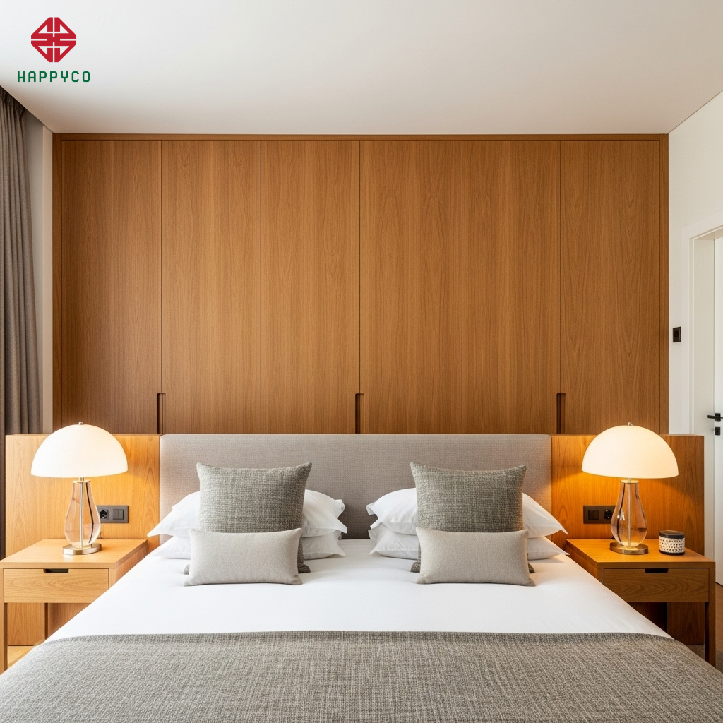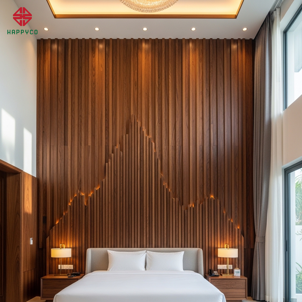 Giải pháp thi công: Happy Décor sử dụng vách ốp gỗ kịch trần bằng gỗ công nghiệp HMR hoặc Veneer. Vách đầu giường được gia cố chắc chắn vào tường, tạo cảm giác như một ngọn núi vững chãi.