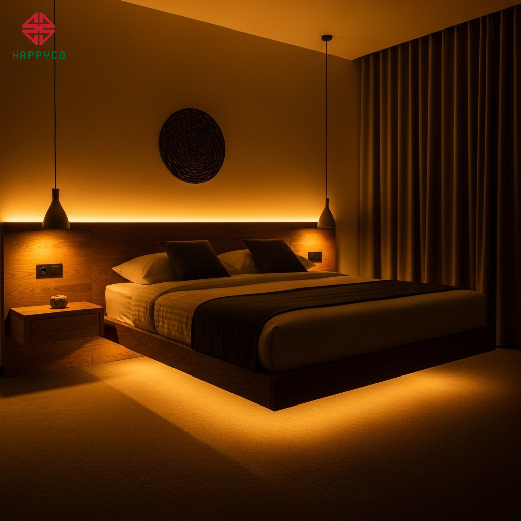 Hiệu quả: Ánh sáng vàng ấm 3000K kích thích cơ thể sản sinh Melatonin tự nhiên. Một không gian ánh sáng mờ ảo, ấm cúng chính là "chìa khóa" để khơi gợi cảm xúc, giúp không gian riêng tư của vợ chồng thêm phần lãng mạn và tinh tế.