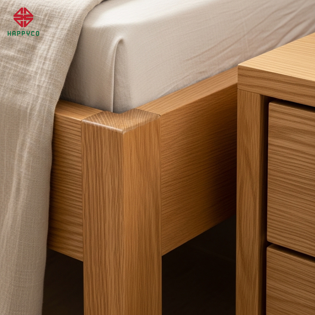 Kỹ thuật xử lý góc cạnh: Toàn bộ giường và tab đầu giường được chúng tôi bo tròn góc (Soft-edge). Việc triệt tiêu các "góc chết" sắc nhọn giúp loại bỏ "sát khí" chĩa vào người khi ngủ, bảo vệ sức khỏe và mang lại sự an tâm tuyệt đối.