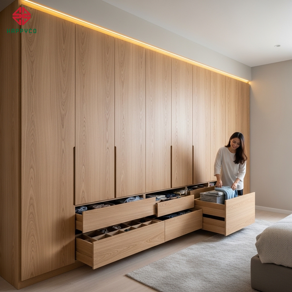 Sai lầm lớn nhất khiến chi phí nội thất đội lên cao là việc "đo ni đóng giày" quá mức cho từng hộc tủ riêng lẻ tại công trình. Happy Décor chuyển đổi toàn bộ tư duy sang hệ thống Module hóa.