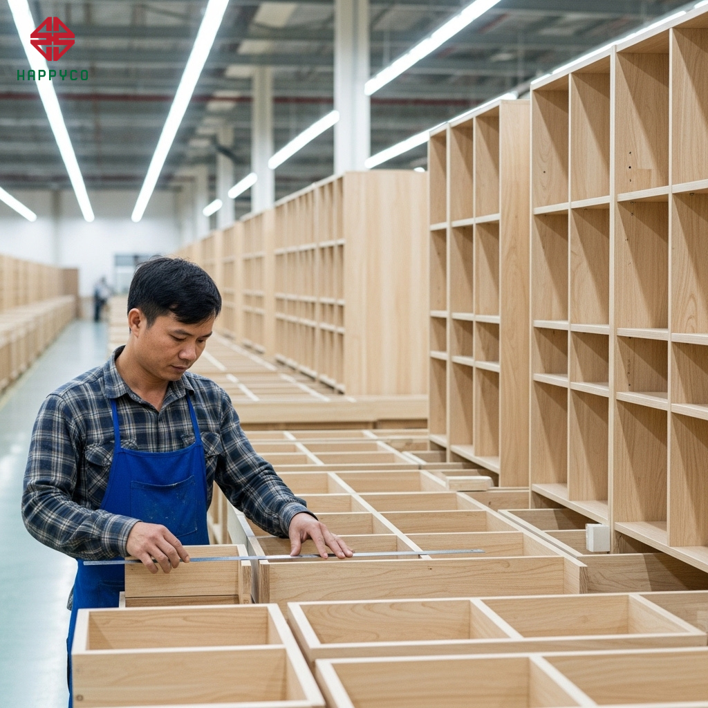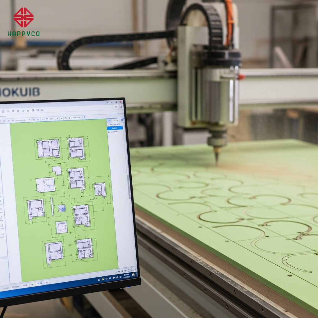 Kỹ thuật số hóa: Happy Décor sử dụng phần mềm Nesting chuyên dụng để "nhồi" tất cả các chi tiết của tủ, bàn, kệ vào khổ ván một cách khít khao nhất. Máy CNC sẽ thực hiện những đường cắt lượn sóng hoặc xéo mà thợ thủ công không thể làm được để tận dụng từng milimet gỗ.