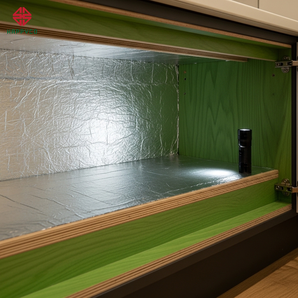 Hòa hợp năng lượng: Việc thông thoáng luồng khí giúp Hỏa khí được nuôi dưỡng bền bỉ, mang lại sự ấm cúng cho gian bếp. Lớp giấy nhôm còn có tác dụng ngăn chặn hoàn toàn hơi nước từ khoang chậu rửa bên cạnh thấm qua vách gỗ, giúp khu vực bếp nấu luôn khô ráo tuyệt đối – một yêu cầu bắt buộc để đảm bảo an toàn điện và phong thủy "Hỏa vượng".