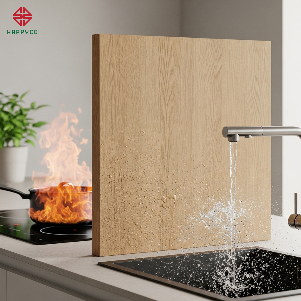 Bảo vệ lõi mộc: Với mật độ sợi gỗ nén cao của ván Kho Mộc, dù ở trong môi trường nhiệt lạnh thay đổi liên tục, cốt ván vẫn giữ được độ ổn định kích thước, không co ngót. Điều này giúp các hệ bản lề, phụ kiện kệ gia vị đặt giữa bếp và chậu rửa luôn vận hành êm ái, không bị kẹt rít hay sệ cánh do gỗ biến dạng theo thời gian.