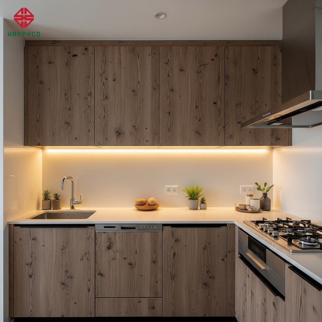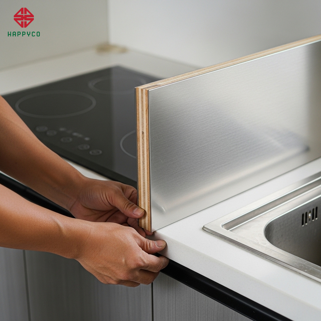 Tại Happy Décor, chúng tôi không chỉ tư vấn hóa giải bằng màu sắc, mà trực tiếp can thiệp bằng Kỹ thuật vách ngăn mộc Hybrid (Mộc - Inox). Bằng việc sử dụng cốt ván HMR của Kho Mộc được bọc lớp bảo vệ chuyên dụng, chúng tôi tạo ra một "bức tường ngăn cách" vô hình nhưng bền bỉ, giúp hài hòa dòng năng lượng và bảo vệ tủ bếp khỏi sự tàn phá của nhiệt và nước.