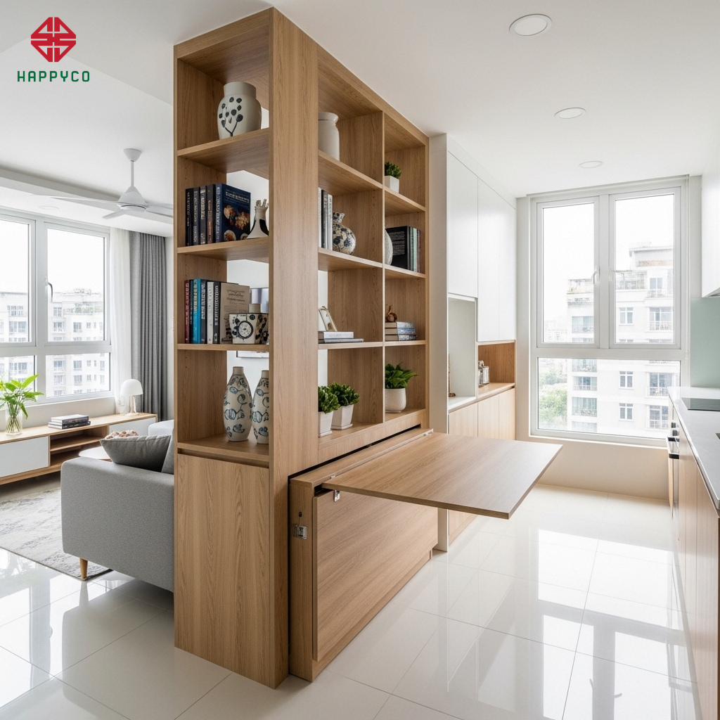 Tại Happy Décor, chúng tôi giải quyết bài toán này bằng kỹ thuật Vách ngăn đa năng (Multi-functional Partition). Đây là sự kết hợp tinh tế giữa nghệ thuật phân chia không gian và cơ khí mộc chính xác trên nền ván HMR của Kho Mộc, giúp gia chủ tiết kiệm tối đa chi phí đầu tư ban đầu mà vẫn đảm bảo tính thẩm mỹ thượng lưu.