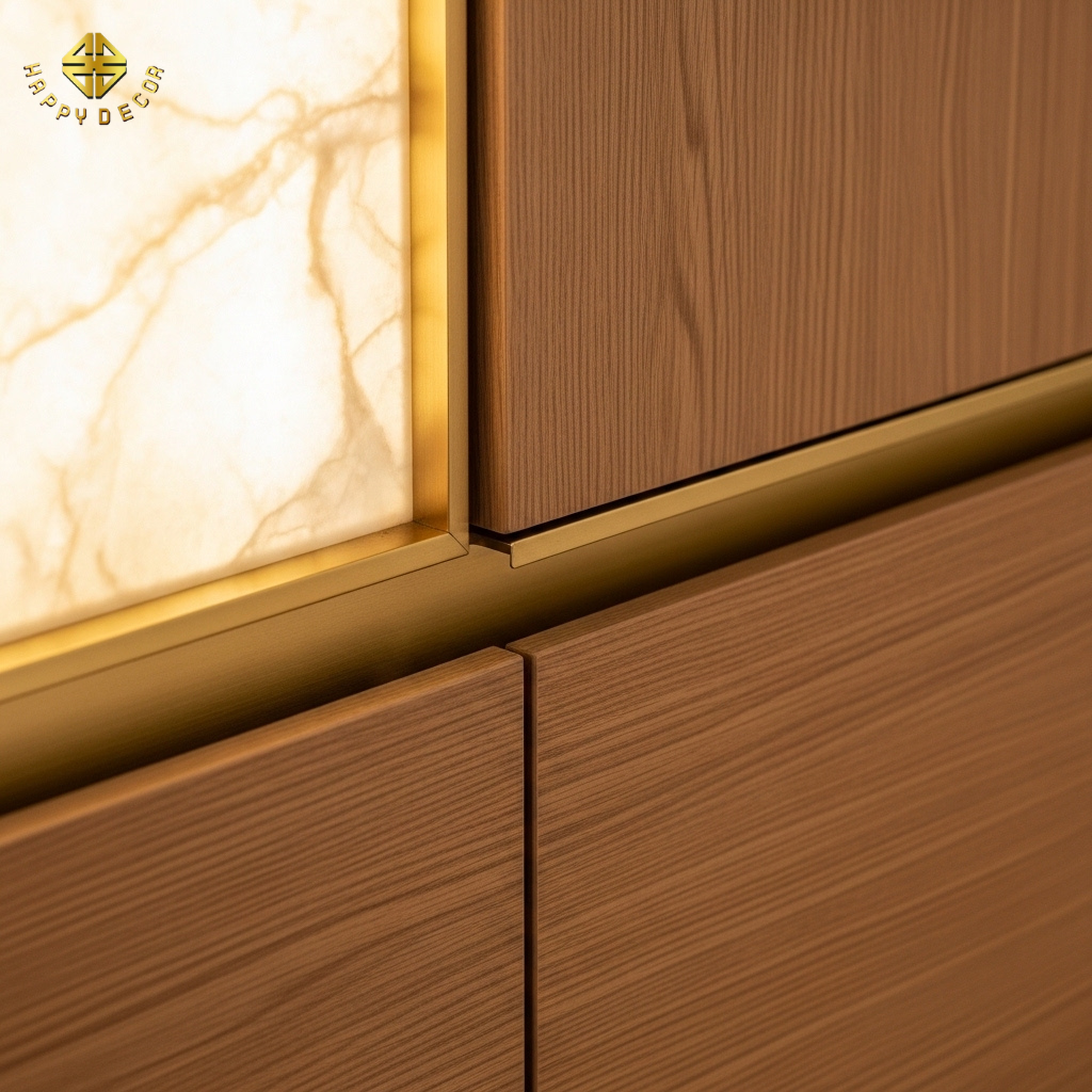 Điểm xuyết nẹp lập là PVD: Trên nền gỗ (Mộc) và đá (Thổ), Happy Décor khảm thêm các đường nẹp Inox 304 mạ PVD vàng gương (Kim). Những đường Line này không chỉ là điểm nhấn sang trọng mà còn giúp định hình không gian, tạo ra sự ngăn nắp và trật tự cho căn phòng.
