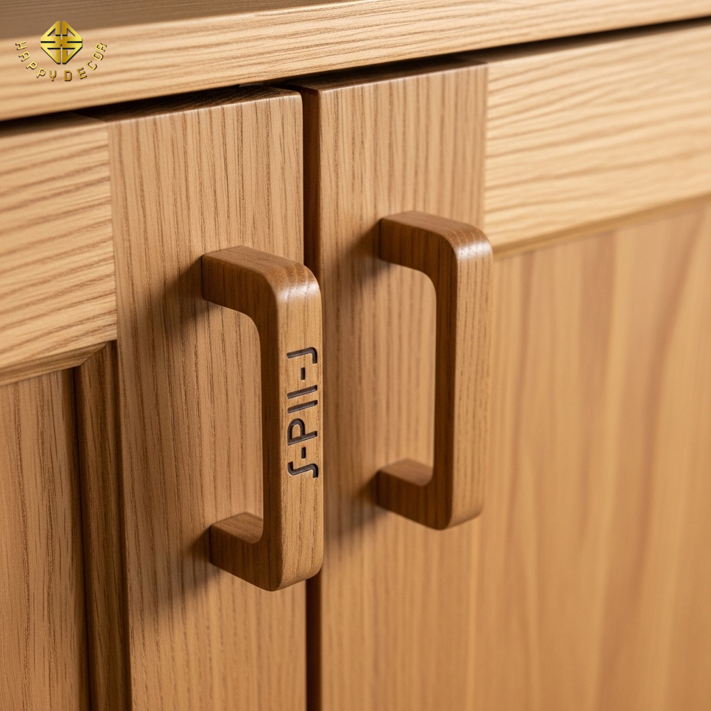 Bản lề âm (Concealed Hinges): Happy Décor sử dụng các dòng bản lề âm hoàn toàn vào thân gỗ. Khi đóng lại, cánh tủ và vách tường tạo thành một khối thống nhất, không hề để lộ bất kỳ chi tiết cơ khí nào. Sự tinh tế này minh chứng cho trình độ thi công thực tế thượng thặng, biến ngôi nhà thành một tác phẩm nghệ thuật mộc bản