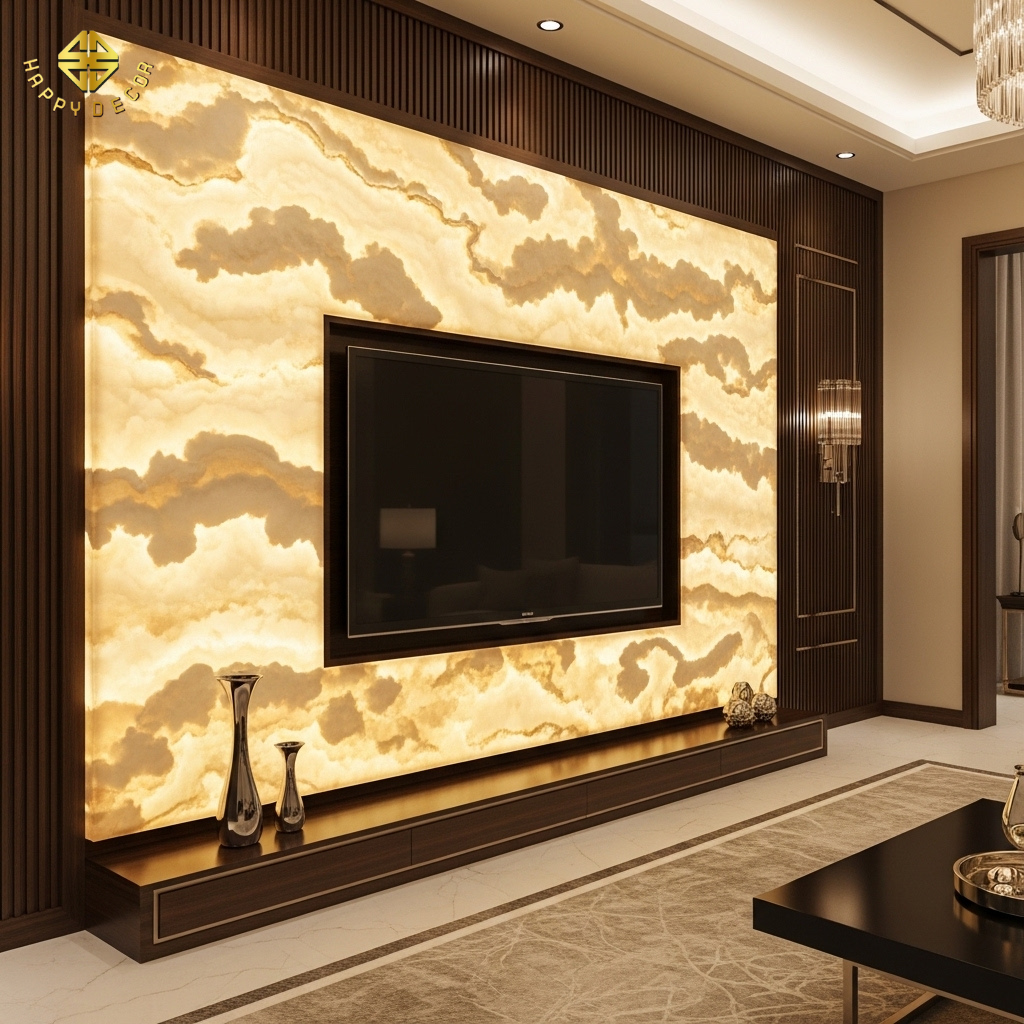 Phòng khách không chỉ là nơi tiếp khách, mà còn là "Minh đường" – nơi tụ khí và quyết định sự thịnh vượng của cả gia đình. Trong kiến trúc hiện đại, một mảng tường Tivi quá nặng nề hoặc rườm rà sẽ làm tắc nghẽn dòng chảy năng lượng. Tại Happy Décor, chúng tôi xử lý bài toán này bằng kỹ thuật Vách xuyên sáng cốt xương HDF Black