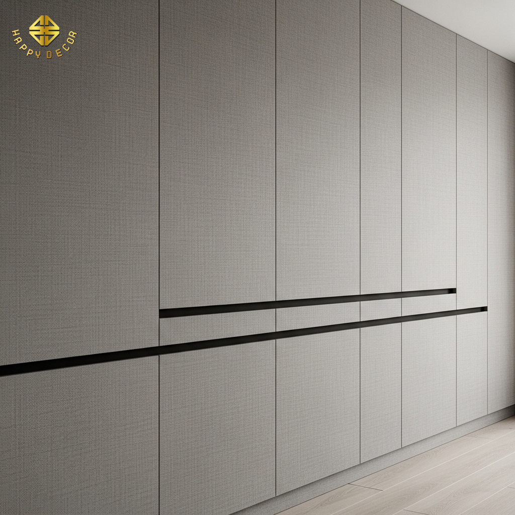 Kỹ thuật lắp đặt Flush-mount: Toàn bộ thân tủ được Happy Décor giấu kín vào hốc tường, mặt cánh tủ phẳng lì với bề mặt tường xung quanh. Chúng tôi sử dụng các tấm ván khổ lớn phủ Melamine vân đá hoặc vải (Fabric) của Kho Mộc để tạo sự đồng nhất.