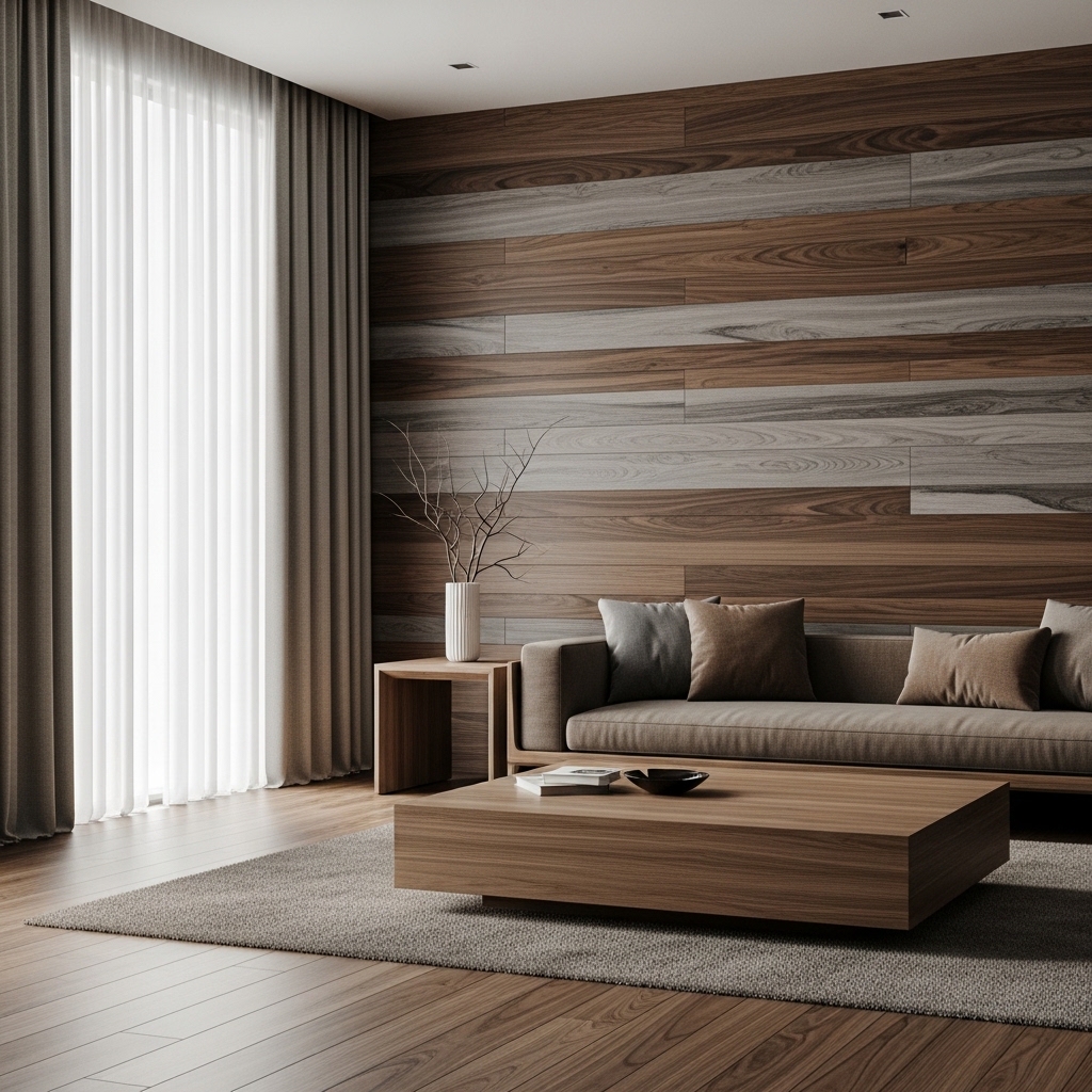 Kỹ thuật phối trộn: Chúng tôi không chỉ dùng một màu. Chúng tôi phối hợp các loại gỗ có tông màu tương đồng nhưng khác biệt về độ đậm nhạt (ví dụ: Gỗ Óc Chó hun khói đi kèm với Veneer màu tro và vải dệt màu bùn).