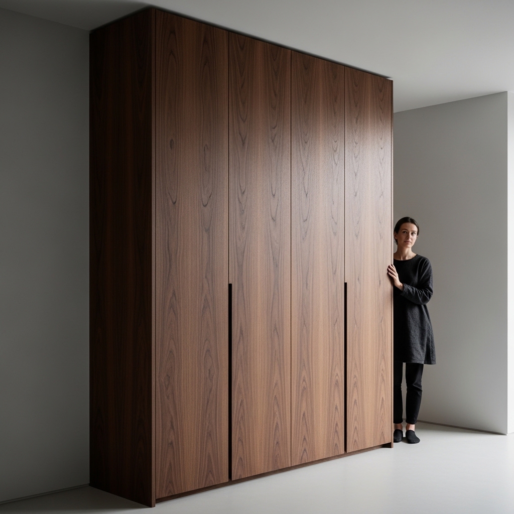 Hiệu ứng: Toàn bộ hệ tủ quần áo hay tủ bếp trông như một bức tường gỗ phẳng lì nguyên khối. Sự biến mất của các chi tiết cơ khí giúp tôn vinh trọn vẹn vẻ đẹp của các đường vân gỗ tự nhiên, biến đồ nội thất thành những khối điêu khắc tĩnh lặng trong không gian.