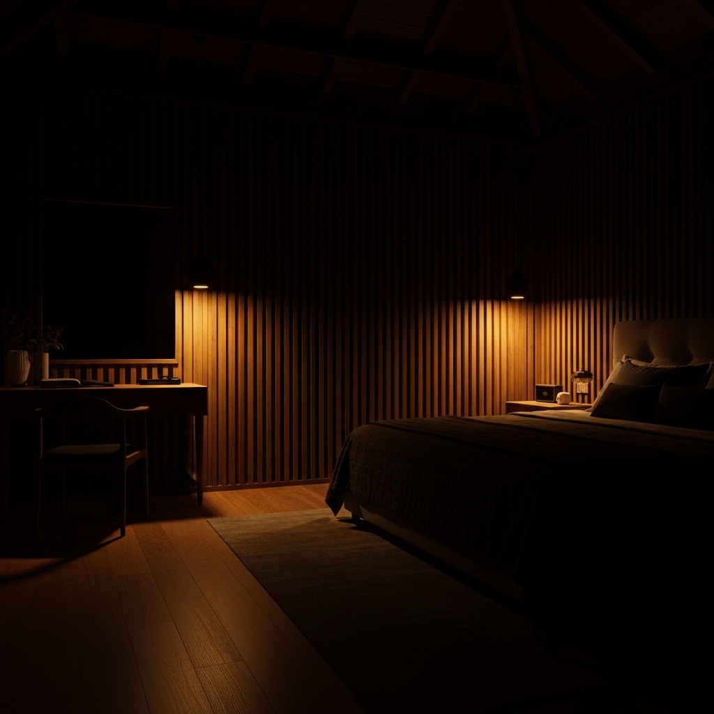 Tác dụng: Ánh sáng chỉ hắt nhẹ lên bề mặt gỗ nhám mờ, tạo ra những vùng sáng tối (Chiaroscuro) đầy kịch tính một cách kín đáo. Nó không làm chói mắt mà chỉ âm thầm tôn vinh chất lượng của vật liệu gỗ, tạo nên một không gian nghỉ ngơi xa xỉ đúng nghĩa "nghỉ dưỡng tại gia".