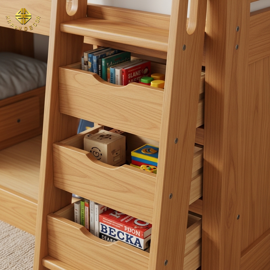 Kỹ thuật thi công: Toàn bộ hệ bậc thang được làm từ ván HMR dày 18mm chịu lực cực cao 200kg. Các ngăn kéo sử dụng ray trượt giảm chấn cao cấp, giúp trẻ nhỏ cũng có thể đóng mở nhẹ nhàng mà không sợ kẹt tay.