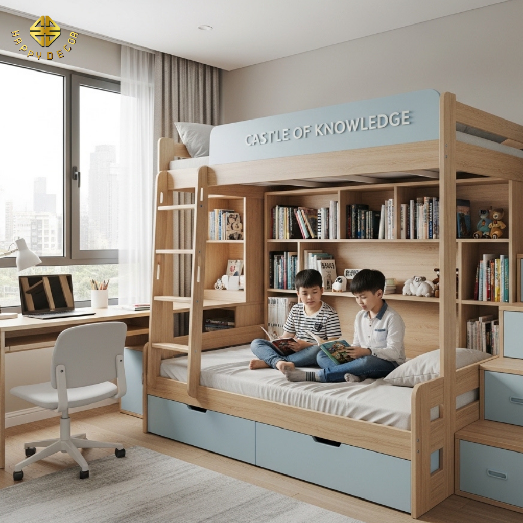 Tại Happy Décor, chúng tôi thay thế khái niệm giường tầng truyền thống bằng hệ "Knowledge Castle" (Lâu đài tri thức). Bằng việc ứng dụng ván HMR của Kho Mộc, chúng tôi kiến tạo nên những module không gian đa tầng, nơi mỗi bậc thang, mỗi hộc tủ đều là một bài học về sự ngăn nắp và sẻ chia.