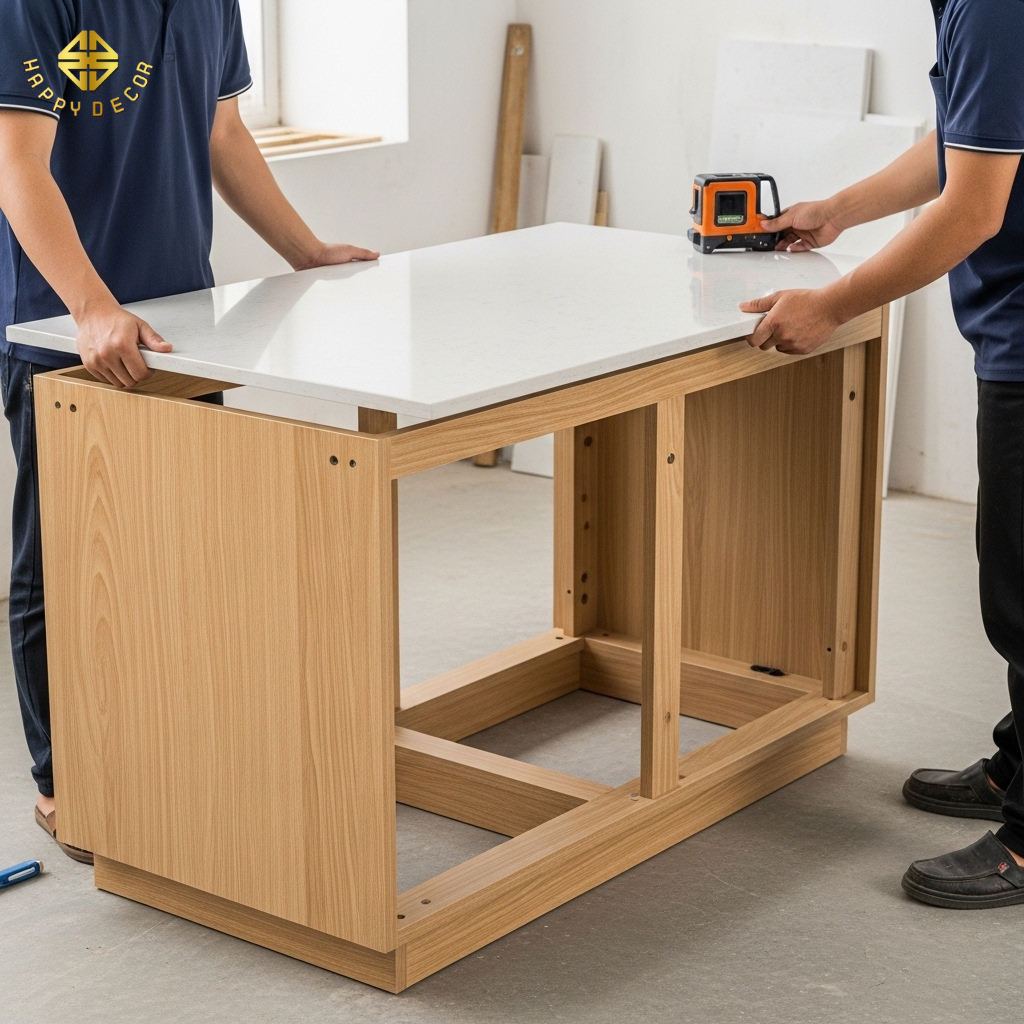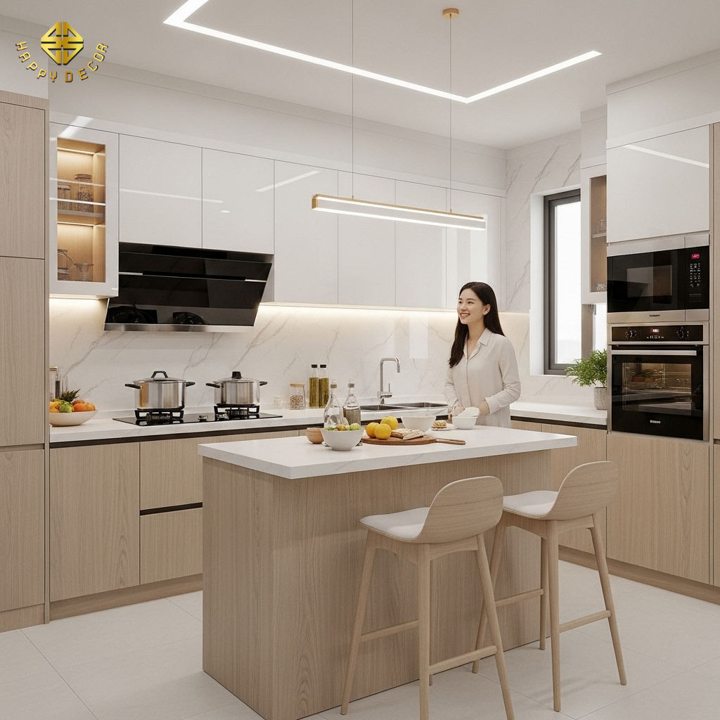 Tại Happy Décor, chúng tôi không thỏa hiệp với những giải pháp nửa vời. Các kỹ sư của chúng tôi ứng dụng kỹ thuật "Mộc - Nhựa Hybrid" (Liên kết mộc lai nhựa). Bằng cách sử dụng nhựa Picomat cao cấp cho các vị trí tiếp xúc nước trực tiếp và ván HMR của Kho Mộc cho hệ khung chịu lực, chúng tôi kiến tạo nên những bộ tủ bếp vừa bất tử trước độ ẩm, vừa vững chãi như bàn thạch qua hàng thập kỷ.