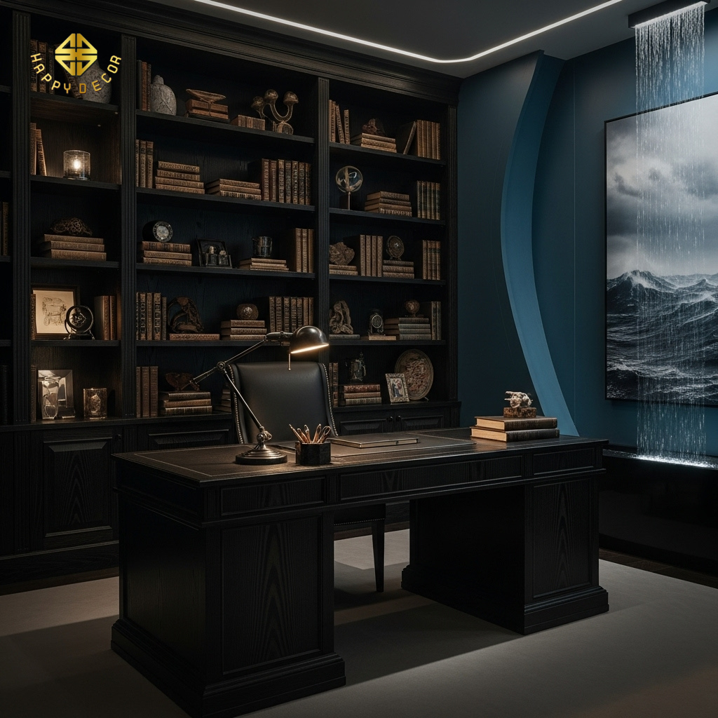 Màu gỗ đột phá: Thay vì dùng gỗ nâu truyền thống, gia chủ mệnh Thủy có thể chọn các mã gỗ Melamine màu đen huyền bí hoặc xám đen vân vải (Textile). Những dải vân gỗ uốn lượn như dòng nước trên nền tối sẽ kích hoạt tối đa năng lượng của hành Thủy.