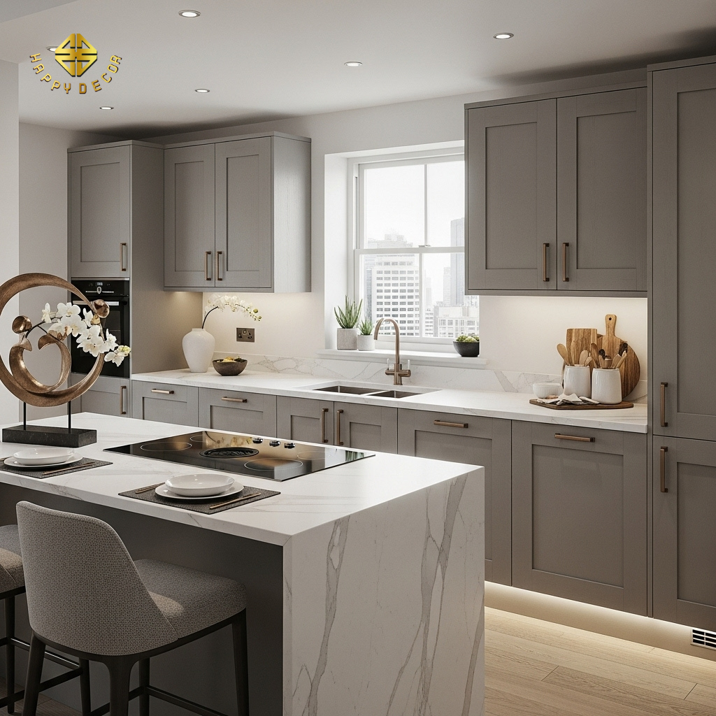 Mẹo phối đồ: Kết hợp tủ gỗ màu xám với các chi tiết nẹp kim loại màu vàng đồng hoặc inox gương. Sự kết hợp giữa gỗ (Mộc) và kim loại (Kim) theo tỷ lệ phù hợp sẽ tạo nên không gian sống quyền lực và sang trọng.