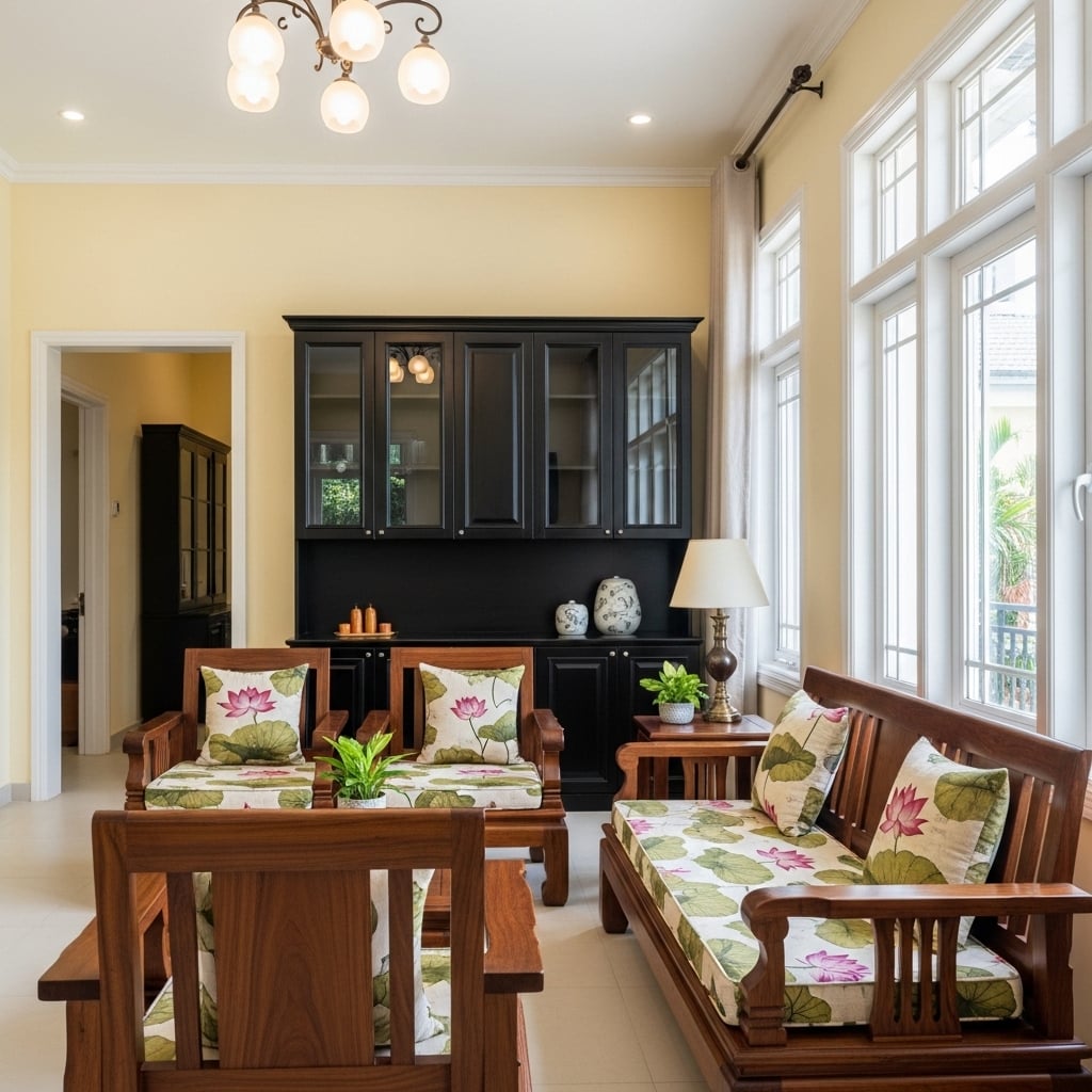 Sự tương phản kinh điển: Chúng tôi sử dụng tông màu vàng kem hoặc trắng sứ cho diện tường để làm nổi bật hệ nội thất gỗ màu đen mun hoặc nâu gụ. Sự đối lập này không chỉ gợi nhắc về những dinh thự xưa mà còn tạo nên chiều sâu quyền quý cho căn nhà.