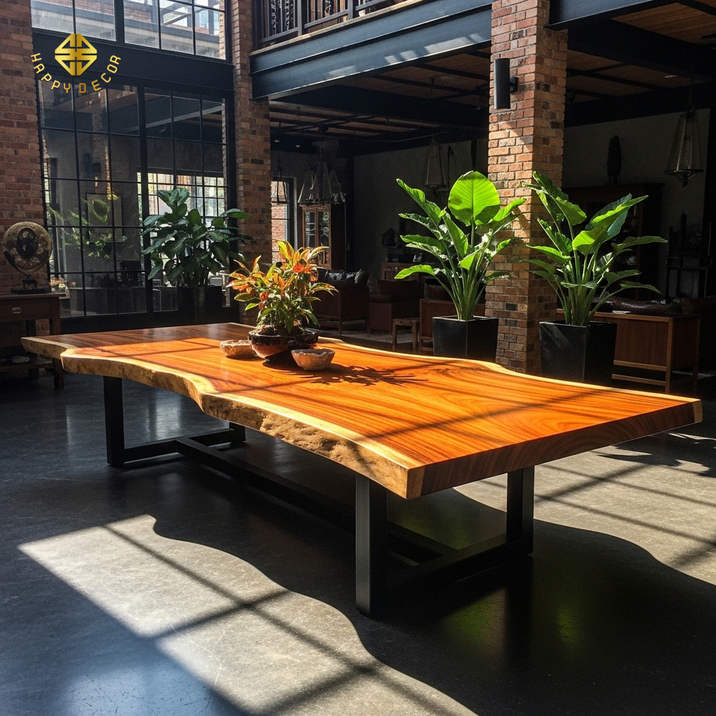 1. Kỹ Thuật "Gỗ Bìa Bắp" (Live Edge) Trong Không Gian Bê Tông Mài