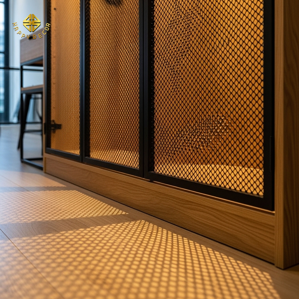 Tác dụng thực tế: Kỹ thuật này không chỉ giúp nội thất trông nhẹ nhàng, thoát xác hơn mà còn giải quyết triệt để vấn đề ẩm mốc trong khí hậu Việt Nam. Luồng khí được luân chuyển xuyên qua cánh tủ, đồng thời khi đèn LED bên trong bật lên, ánh sáng xuyên qua lưới thép tạo nên những hiệu ứng bóng đổ (Pattern) cực kỳ ma mị lên sàn nhà.
