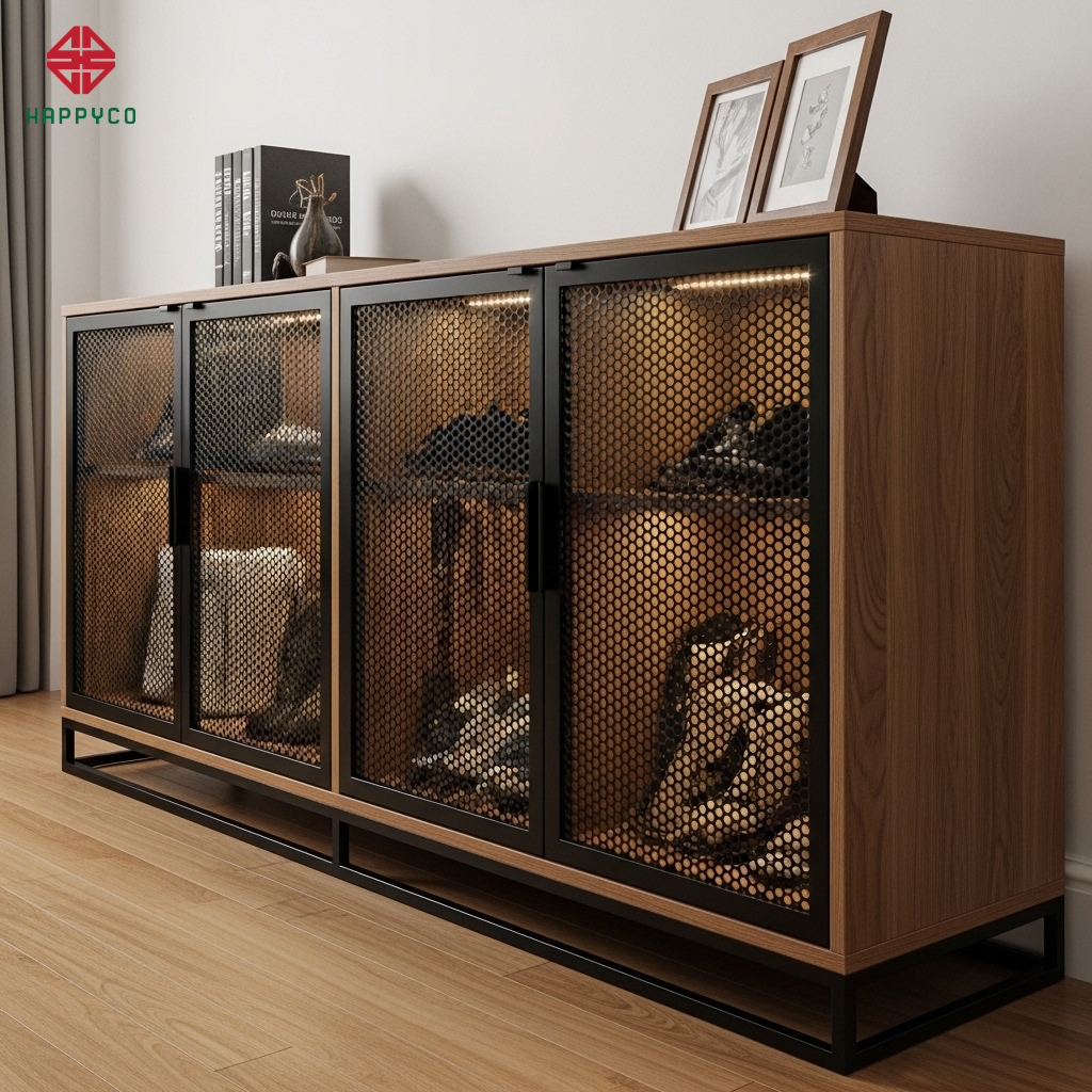 Công năng và thẩm mỹ: Hệ cánh này giúp các khoang tủ chứa thiết bị điện tử hoặc giày dép được thông thoáng, tản nhiệt tốt. Về mặt thị giác, sự xuyên thấu mờ ảo của lưới thép trên nền ván giả bê tông tạo nên một vẻ đẹp đầy lôi cuốn, nửa kín nửa hở, nâng tầm đẳng cấp cho ngôi nhà.