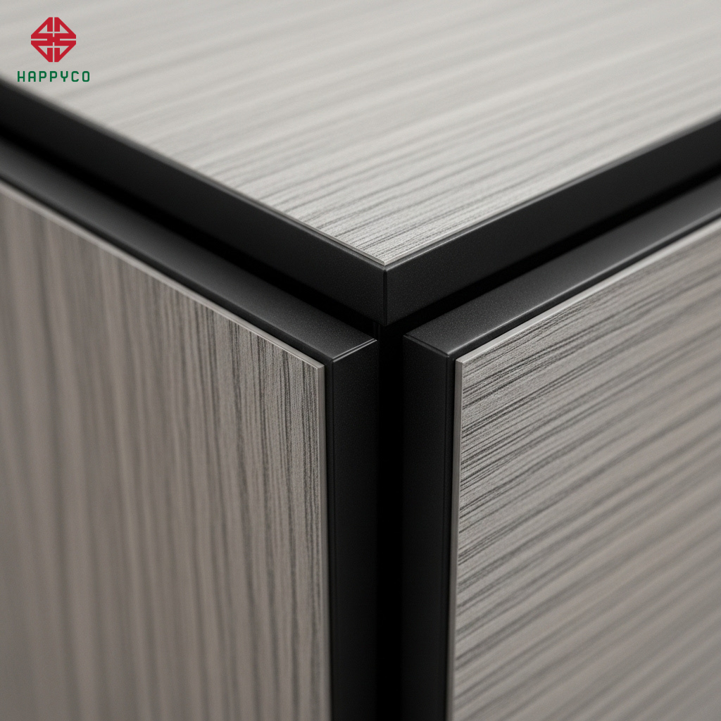 Kỹ thuật bọc cạnh: Toàn bộ cánh tủ ván HMR được bo viền bằng nẹp nhôm Slim siêu mỏng ($1\text{--}2\text{mm}$). Nhôm được xử lý mạ Anode đen mờ, không chỉ bảo vệ mép ván khỏi va đập mà còn tạo ra những đường viền sắc sảo như tranh vẽ.