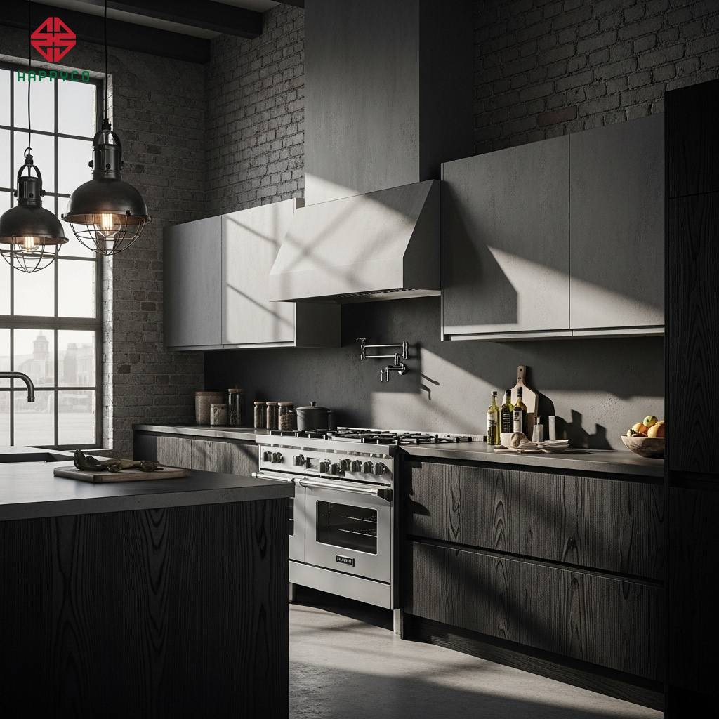 Phong cách Industrial (Công nghiệp) năm 2026 đã thoát ly khỏi vẻ ngoài bụi bặm, nhếch nhác để tiến tới một đẳng cấp mới: Soft-Industrial. Đây là sự giao thoa giữa những bề mặt thô ráp như bê tông, thép gỉ với sự tinh tế của các hệ khung nhôm định hình và ván gỗ công nghiệp cao cấp. Tại Happy Décor, chúng tôi không dùng bê tông thật để làm tủ, chúng tôi dùng Kỹ thuật phối vật liệu đa tầng để tạo ra một không gian đầy chiều sâu và cảm xúc.