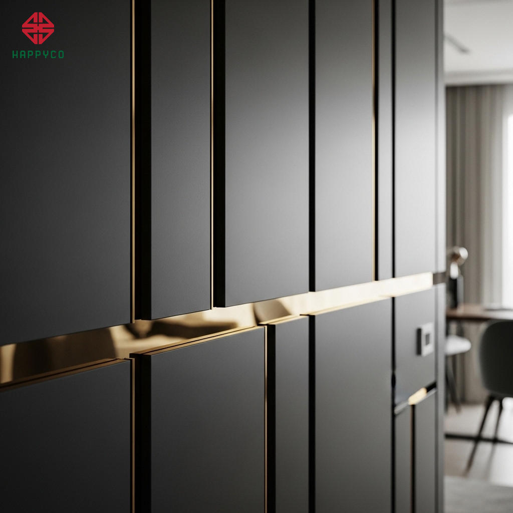 Tư duy chọn vân (Grain Matching): Happy Décor lựa chọn các tấm ván có vân gỗ chạy dọc hoặc ngang đồng nhất. Kỹ thuật này đòi hỏi người thợ phải cắt ván một cách có tính toán trên phần mềm CNC để khi ốp lên tường, các đường vân gỗ nối tiếp nhau như một dòng chảy tự nhiên.