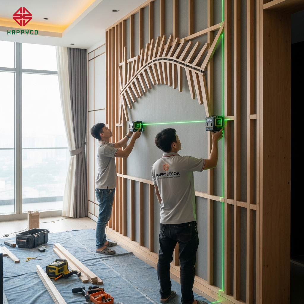 Trong các bản vẽ 3D, hệ vách ốp tường luôn trông như một mặt phẳng hoàn hảo. Nhưng khi thi công thực tế, nhiều gia chủ tại Biên Hòa phải thất vọng khi nhìn thấy những đường lằn đen kịt giữa các tấm ván, hoặc sau vài tháng, vách bị cong vênh, hở hoác. Tại Happy Décor, chúng tôi coi việc thi công vách ốp là một cuộc chơi của sự chính xác và logic. Để đạt được độ phẳng "Seamless" (không đường line), người thợ phải làm chủ 4 kỹ thuật cốt lõi sau.