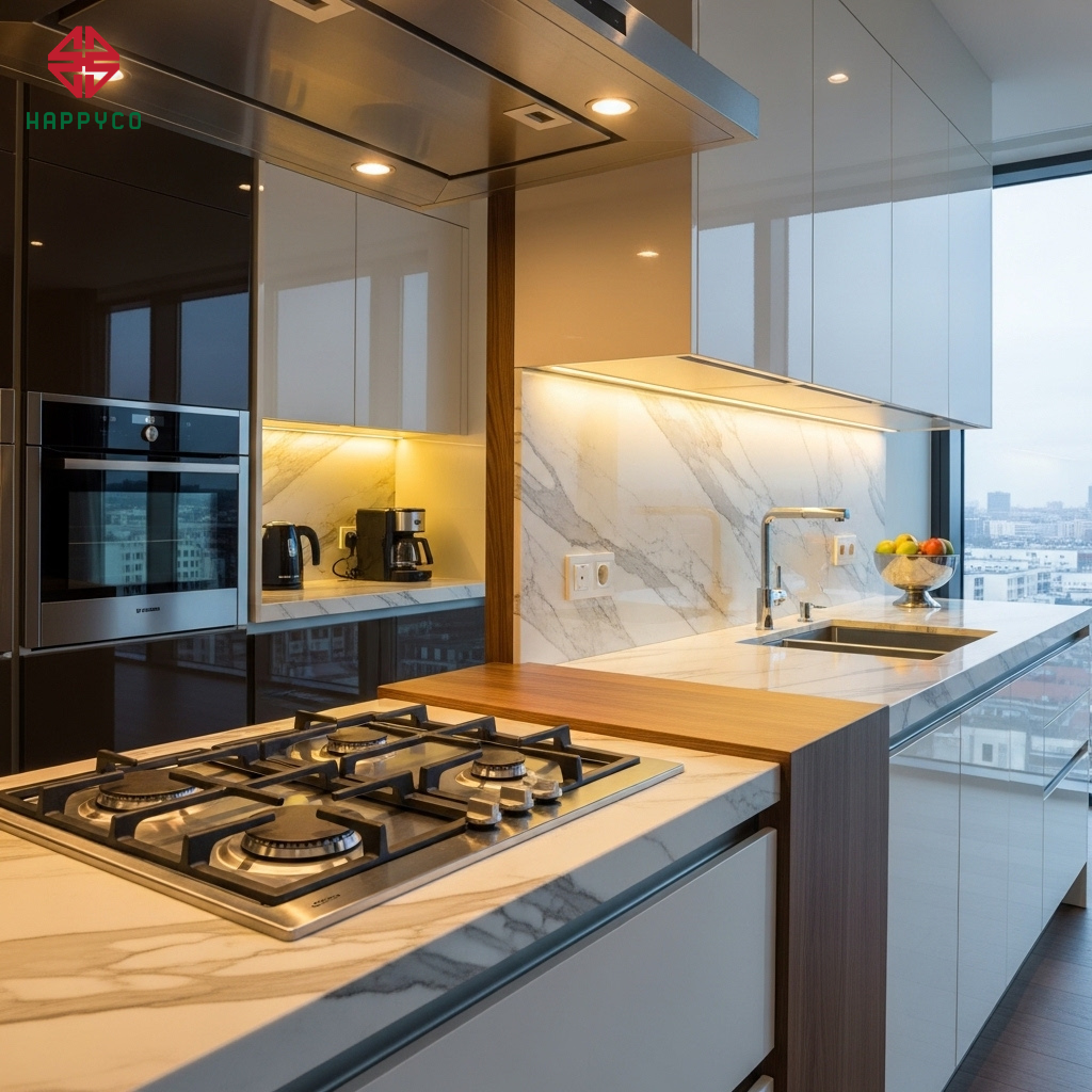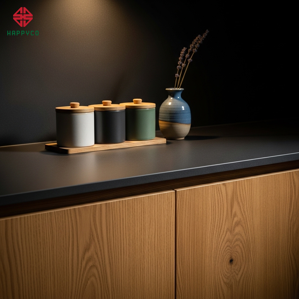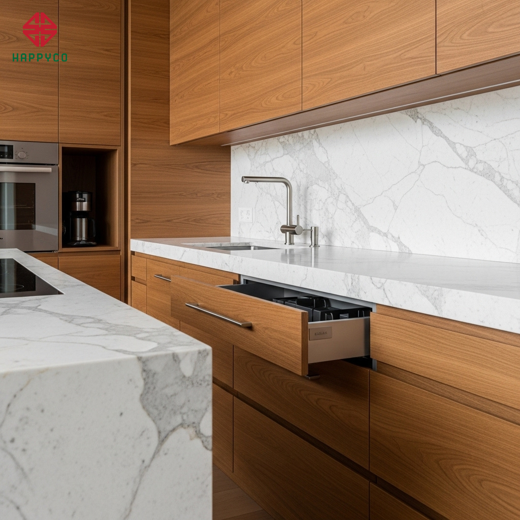 Đẳng cấp của sự hoàn thiện: Tại Happy Décor, mọi mối nối giữa mặt đá và tủ gỗ, mọi đường chỉ cạnh đều đạt độ khít khao milimet. Sự phẳng lỳ, liền mạch (seamless) không chỉ mang lại vẻ sang trọng mà còn giúp dòng khí trôi chảy không vật cản.