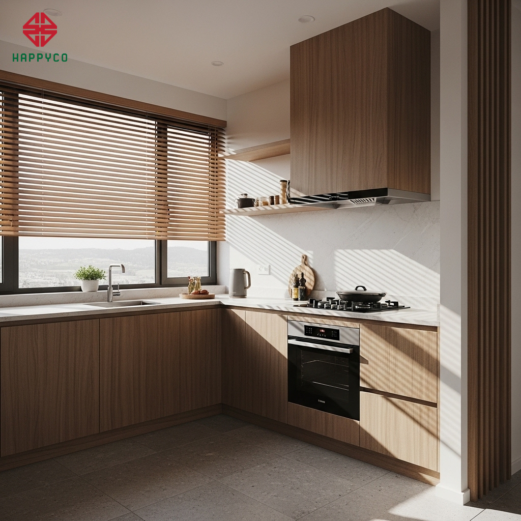 Tầm nhìn chiến lược: Bếp nấu tại Happy Décor luôn được đặt tại vị trí có "điểm tựa" vững chãi, tránh đặt dưới cửa sổ hay đối diện trực tiếp cửa nhà vệ sinh, giúp gia chủ luôn giữ được sự tỉnh táo và quyền uy trong việc quản trị tài chính gia đình.