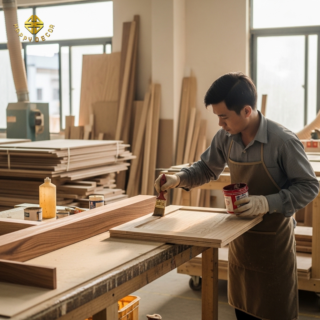 Kỹ thuật lau màu (Wood Staining): Tại xưởng Happy Décor, chúng tôi chọn loại Veneer (lớp gỗ tự nhiên lạng mỏng) cùng loại với gỗ đặc để dán lên cốt gỗ công nghiệp. Sau đó, thợ sơn sẽ lau màu thủ công đồng thời cả hai bề mặt.