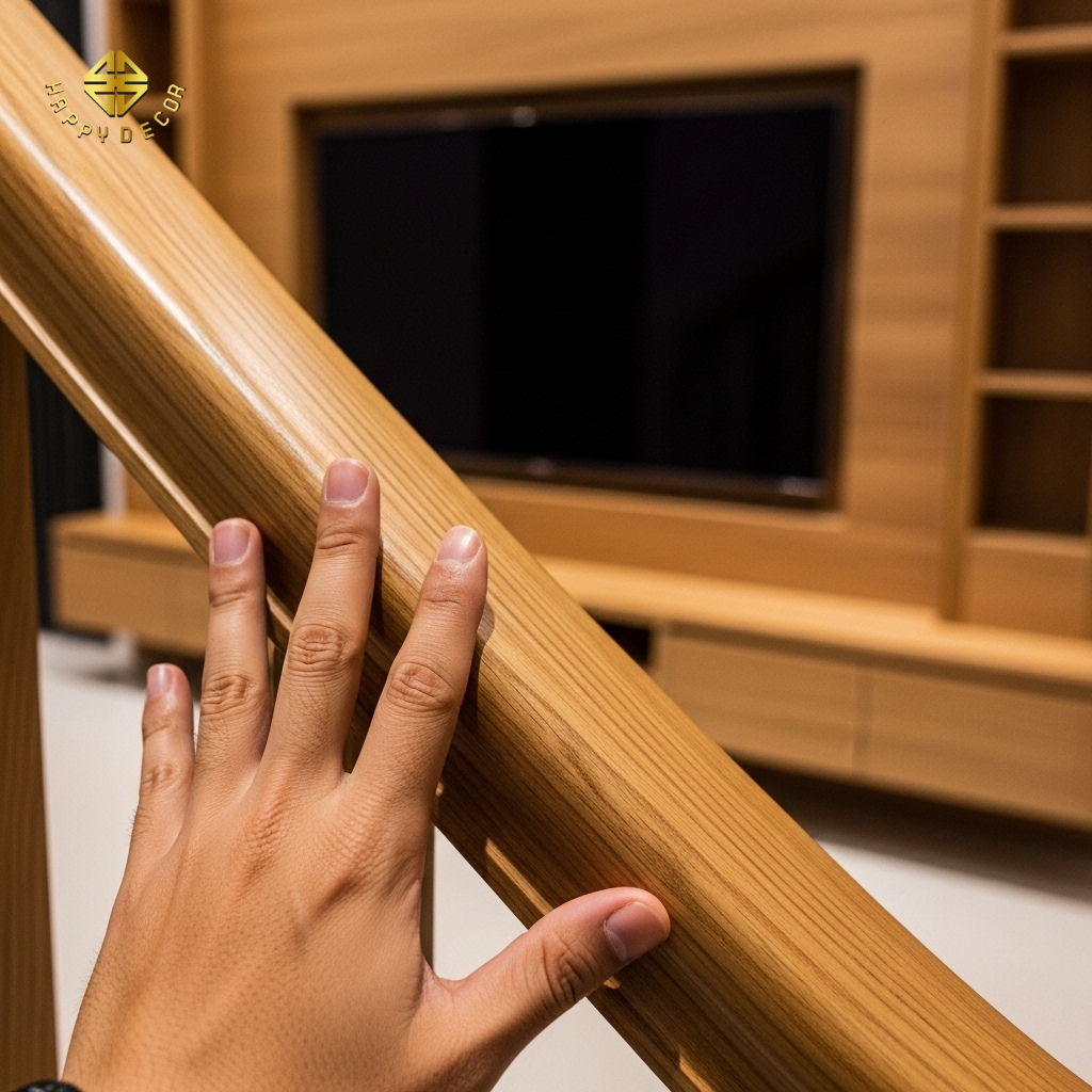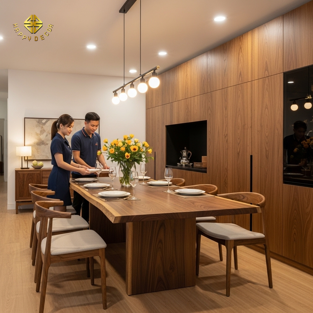 Tại Happy Décor, chúng tôi áp dụng chiến lược "Điểm Chạm Vàng" – kết hợp khéo léo giữa gỗ tự nhiên và gỗ công nghiệp (MDF, Plywood). Giải pháp này giúp gia chủ tiết kiệm ít nhất 30% tổng chi phí nhưng vẫn sở hữu không gian sống đầy tính nghệ thuật và độ bền vượt thời gian.