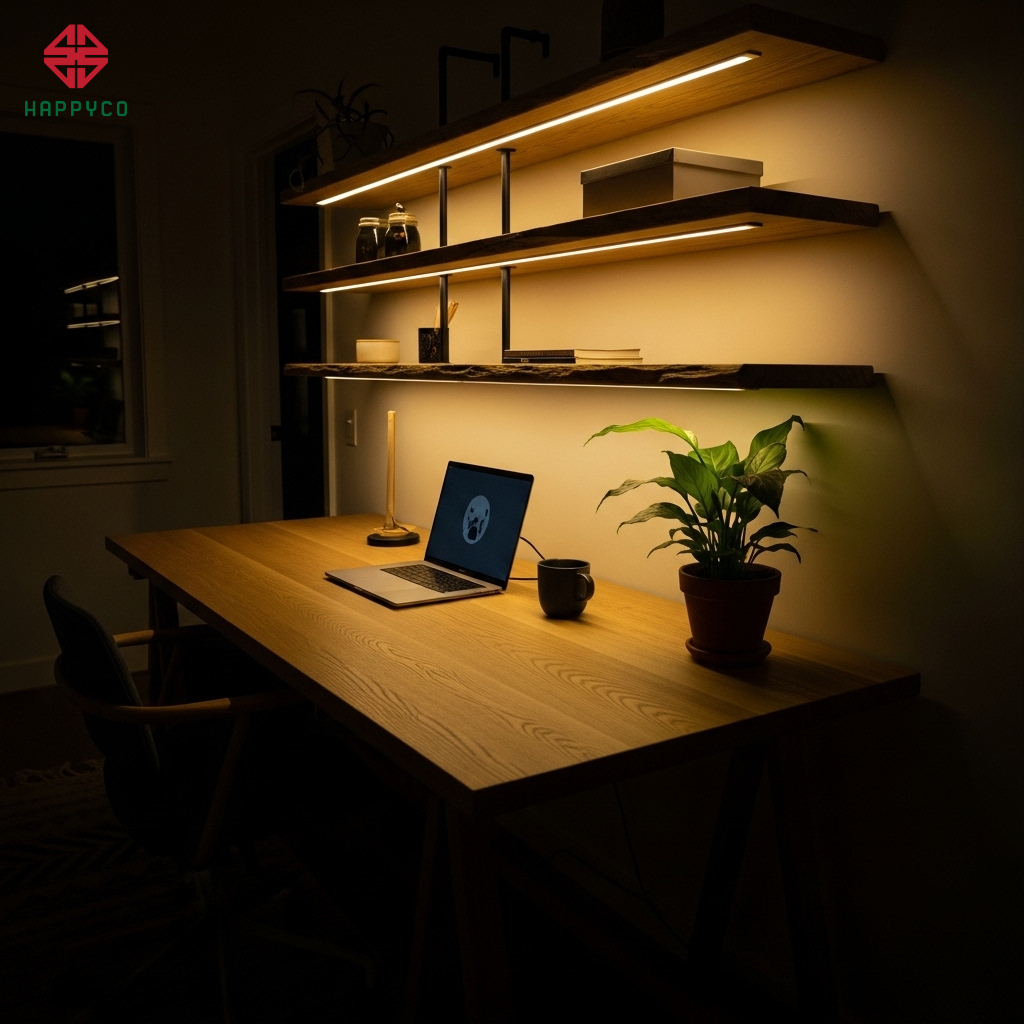 LED gầm kệ che khuất: chúng tôi phay rãnh âm sâu bên dưới đáy kệ gỗ để giấu hoàn toàn dải đèn LED. Ánh sáng chỉ hắt xuống mặt bàn mộc, tạo ra một "đảo ánh sáng" tập trung cho công việc.
