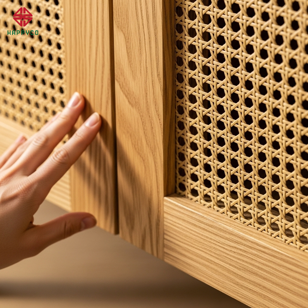 Vật liệu tự nhiên: Chúng tôi kết hợp gỗ Melamine màu sồi nhạt với các chi tiết cánh tủ đan mây (Rattan). Mây không chỉ giúp tủ mộc được thông thoáng mà còn làm mềm đi các đường nét cơ khí cứng nhắc của nội thất hiện đại.