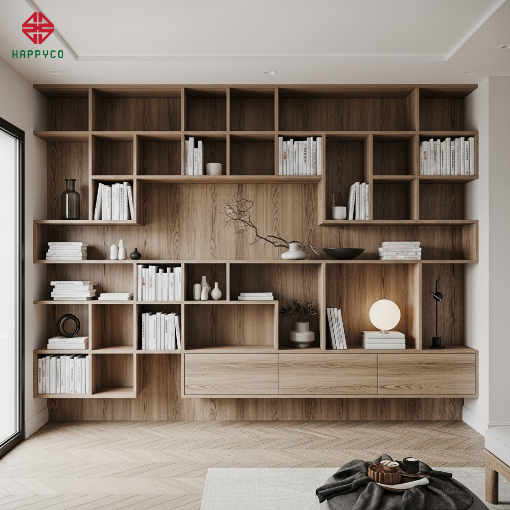 Kỹ thuật chia hộc không đối xứng: Thợ mộc Happy Décor thi công các hệ kệ gỗ với độ dày ván khác nhau, tạo ra nhịp điệu ziczac trên tường. Các hộc tủ được tính toán milimet để vừa vặn với các loại bìa hồ sơ tiêu chuẩn.