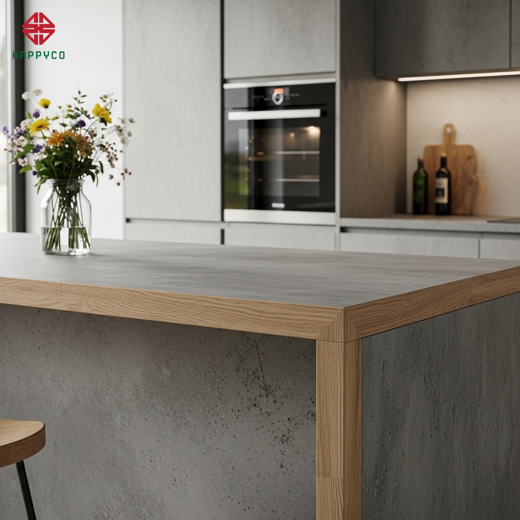 Bề mặt giả chất liệu: Sử dụng các dòng Melamine vân xi măng với bề mặt sần (Texture) chân thực. Khi chạm tay vào, bạn vẫn cảm nhận được độ nhám của bê tông nhưng lại mang nhiệt độ ấm áp của gỗ, không gây cảm giác lạnh lẽo khi sử dụng vào mùa đông.