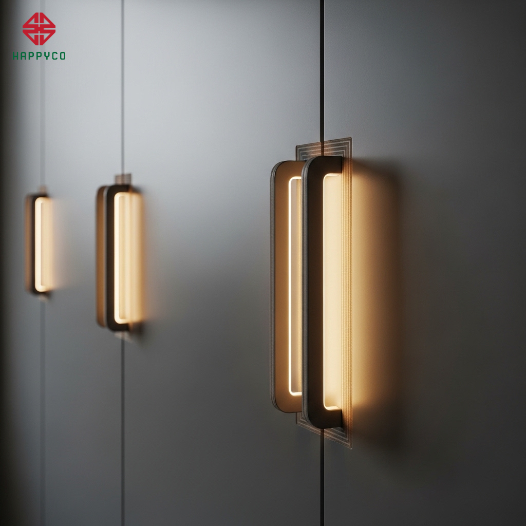 Kỹ thuật phay âm dải sáng: Happy Décor phay các rãnh LED chạy dọc theo các khối mộc thô. Ánh sáng thường là tông cam ấm hoặc vàng hổ phách, hắt qua các khe hở của nan gỗ, tạo nên hiệu ứng thị giác cực kỳ mạnh mẽ như những tia lửa trong xưởng mộc.