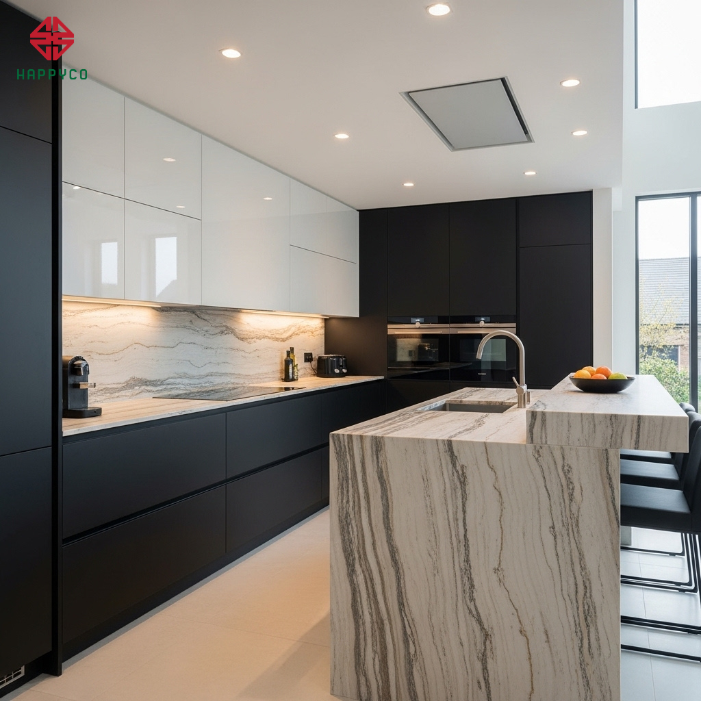 Sự đối lập hoàn hảo: Chúng tôi kết hợp những mảng ván Laminate mờ (Matt) có chiều sâu với các cánh tủ Acrylic bóng gương lộng lẫy. Sự phản chiếu của Acrylic làm không gian rộng mở, trong khi độ trầm của Laminate giữ lại vẻ tĩnh lặng, ấm áp cho ngôi nhà.