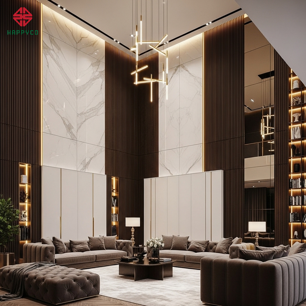 Một ngôi nhà Luxury không bao giờ đơn điệu. Tại Happy Décor, chúng tôi tư vấn gia chủ cách "chơi" vật liệu để tạo chiều sâu cho không gian: