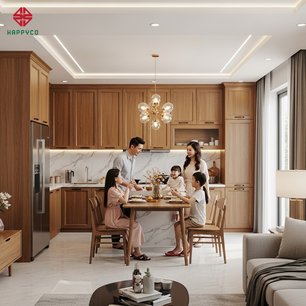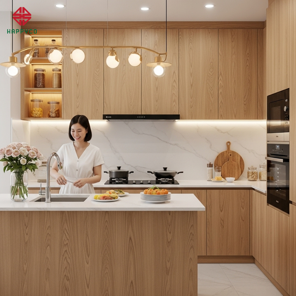 Quy tắc phối màu: Happy Décor thường tư vấn gia chủ sử dụng tông màu gỗ sồi sáng hoặc trắng kem cho hệ tủ trên để "đánh lừa" thị giác, giúp trần nhà trông cao hơn. Hệ tủ dưới có thể sử dụng tông màu gỗ trầm hơn để tạo điểm tựa vững chãi.