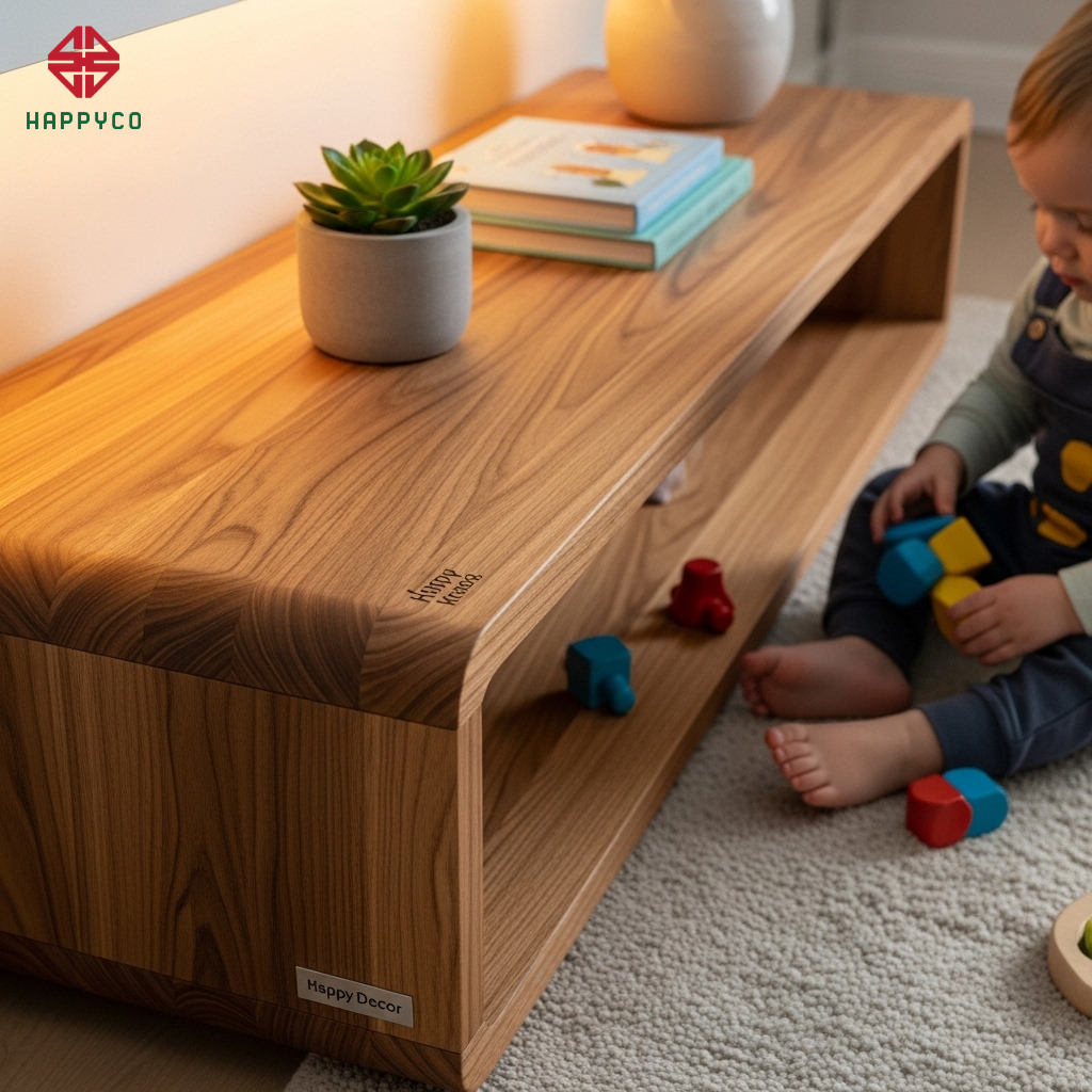 Xử lý góc bo "tâm lý": Tại Happy Décor, chúng tôi thực hiện kỹ thuật bo tròn (round edge) cho tất cả các cạnh bàn, kệ tủ và bệ ngồi. Những đường cong mềm mại này không chỉ là xu hướng thẩm mỹ mà còn là sự bảo vệ thầm lặng, giúp trẻ con thoải mái chạy nhảy mà không lo va chạm.