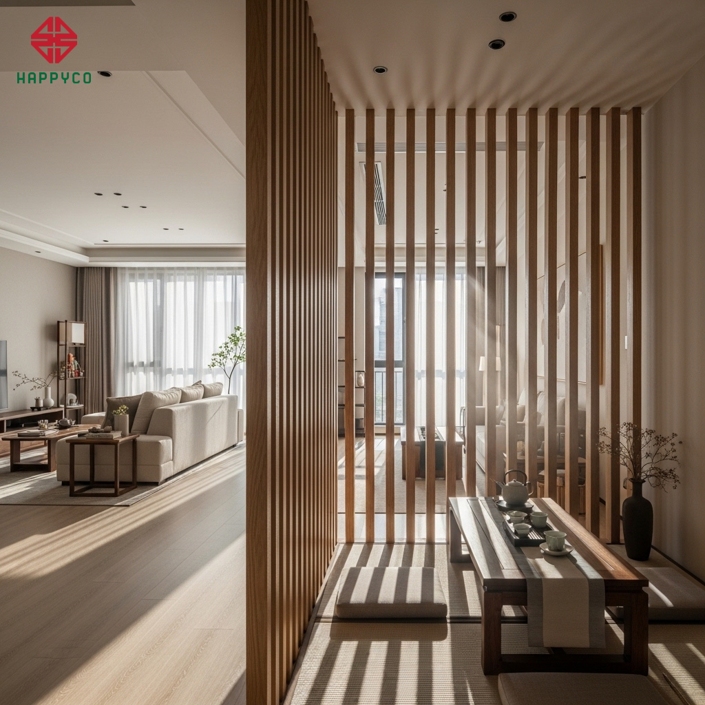 Không gian "vùng đệm": Happy Décor thường thiết kế những khoảng đệm bằng vách ngăn nan gỗ hoặc hệ tủ mở. Điều này giúp ngăn cách phòng ngủ của ông bà với khu vực chơi đùa của con trẻ một cách tinh tế. Không gian vẫn thông thoáng nhưng đảm bảo sự yên tĩnh tuyệt đối cho người lớn tuổi cần nghỉ ngơi.