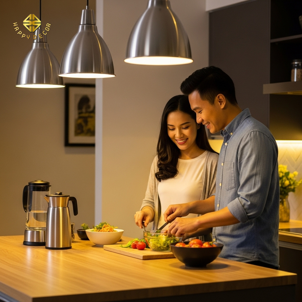 Thay vì thiết kế bếp kiểu cũ khiến người vợ phải quay lưng lại với gia đình, xu hướng bếp có bàn đảo (Island) hoặc bán đảo (Peninsula) đang thay đổi hoàn toàn cục diện. Đây là nơi chồng có thể ngồi nhâm nhi ly rượu vang trò chuyện cùng vợ khi cô ấy đang chuẩn bị món ăn, hoặc là nơi cả hai cùng nhau nhặt rau, trang trí món ăn. Sự tương tác này xóa bỏ cảm giác "nghĩa vụ" và biến nấu nướng thành khoảnh khắc tận hưởng chung.