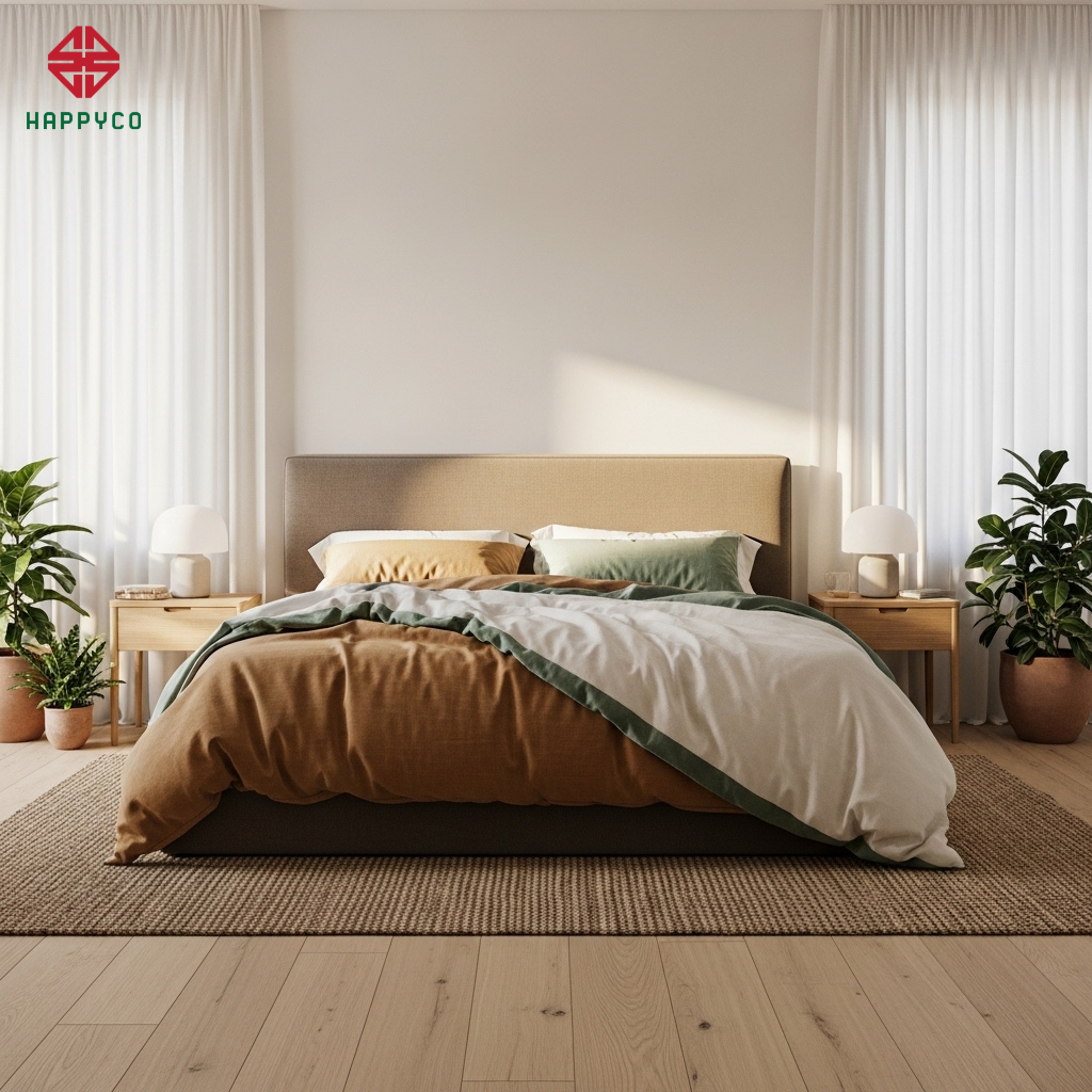 Bảng màu "an thần": Happy Décor sử dụng các tông màu đất, màu gỗ hoặc màu pastel trung tính để tạo ra không gian ấm áp, bình yên. Việc hạn chế các thiết bị điện tử và ánh sáng gắt trong phòng ngủ giúp nhịp sinh học được ổn định, tái tạo năng lượng hoàn hảo sau một ngày làm việc.