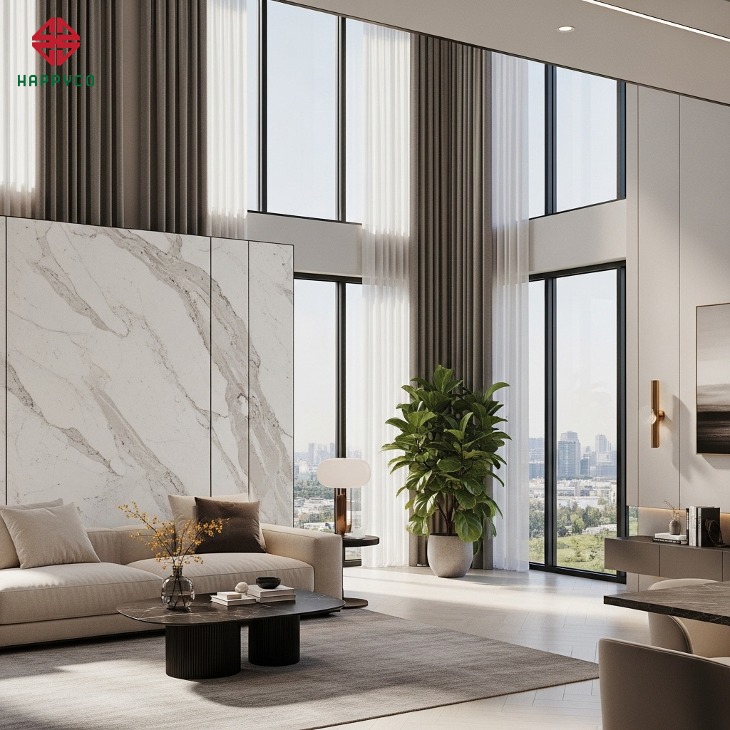 Quy tắc "Minh đường" thông thoáng: Chúng tôi ưu tiên thiết kế phòng khách ở vị trí trung tâm, gần cửa chính với hệ cửa kính lớn để đón ánh sáng tự nhiên. Một căn phòng tràn ngập ánh sáng mặt trời sẽ giúp tiêu tan âm khí, giúp gia chủ luôn minh mẫn và quyết đoán trong công việc.
