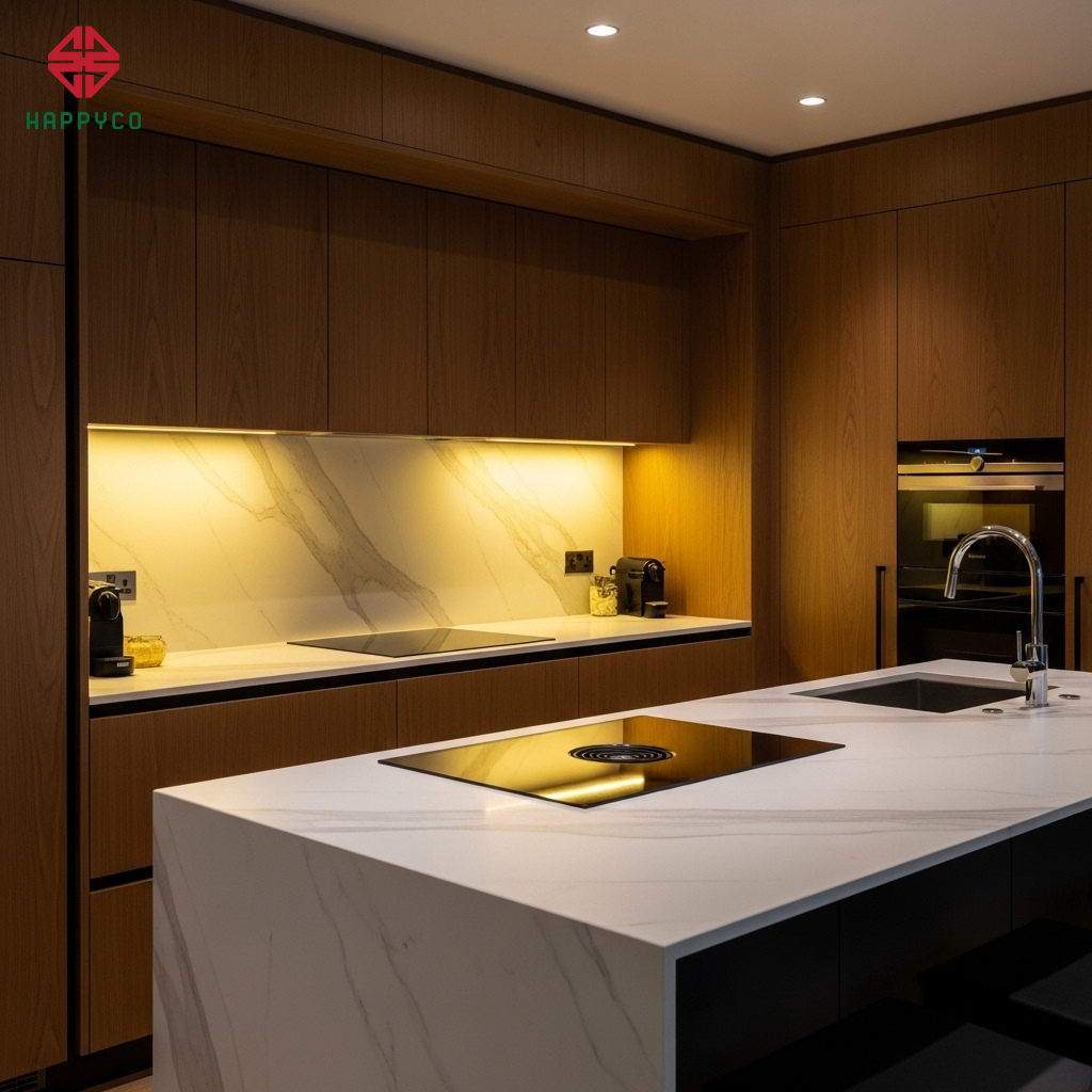 Nguyên lý Thủy - Hỏa bất tương dung: Trong thi công, chúng tôi tính toán khoảng cách giữa bếp nấu (Hỏa) và bồn rửa (Thủy) tối thiểu là 60cm. Việc tách biệt hai yếu tố xung khắc này giúp gia đình tránh được những mâu thuẫn không đáng có và giữ cho tài lộc không bị thất thoát.