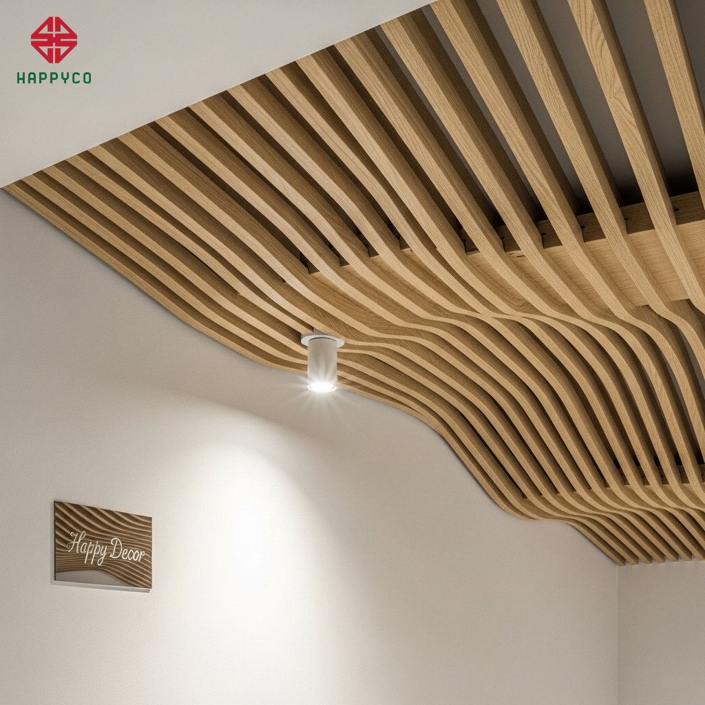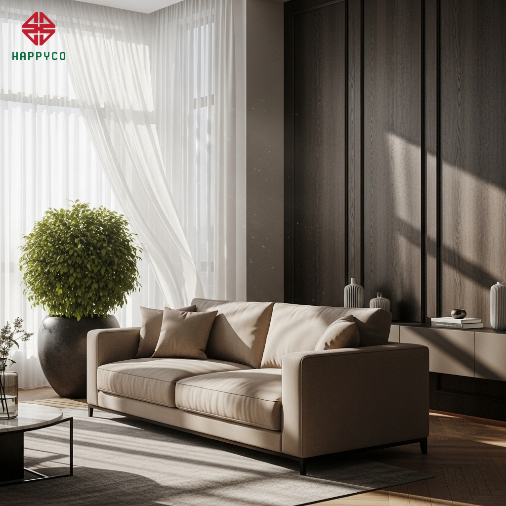 Xử lý góc nhọn và đà ngang: Trong quá trình thi công, Happy Décor sử dụng kỹ thuật trần thạch cao phẳng hoặc các hệ nan gỗ để che đi những đà ngang nặng nề phía trên giường ngủ hay sofa. Các góc cột nhọn được bo cong tinh tế để triệt tiêu "sát khí", giúp không gian trở nên mềm mại và an toàn.