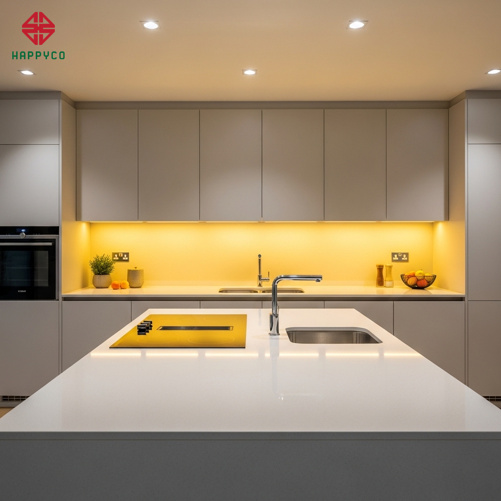 Hóa giải xung khắc Thủy - Hỏa: Một sai lầm phổ biến là đặt bếp nấu quá gần bồn rửa. Happy Décor luôn xử lý kỹ thuật để đảm bảo khoảng cách an toàn (tối thiểu 60cm) hoặc bố trí theo hình chữ L/U để ngăn chặn sự xung đột năng lượng, giúp gia đình tránh được những mâu thuẫn vụn vặt và giữ vững tài chính.