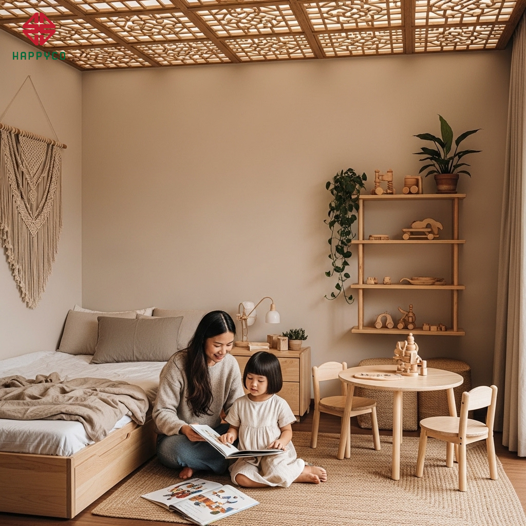 Tại Happy Décor, chúng tôi thay đổi tư duy này bằng kỹ thuật Nội thất Module linh hoạt. Bằng cách sử dụng cốt ván HMR chuẩn từ Kho Mộc, chúng tôi chế tác những hệ mộc có khả năng tháo lắp, thay đổi công năng theo từng giai đoạn phát triển của trẻ, biến phòng ngủ thành một "người bạn đồng hành" thực thụ suốt tuổi thơ.